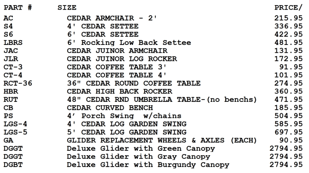 Cedar Furniture Pricing